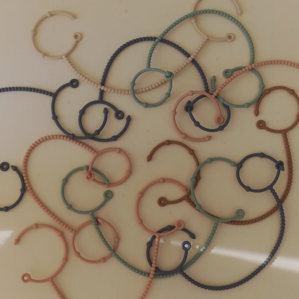 Mushie's adjustable silicone straps keep baby essentials secure so parents and littles on-the-go can enjoy more peaceful outings. Help prevent dropped toys, pacifiers, and sippy cups with these versatile straps designed to attach to strollers, high chairs, car seats, and more. An adjustable closure on each end ensures a snug fit for various items, while the durable non-toxic silicone material withstands daily wear and tear.