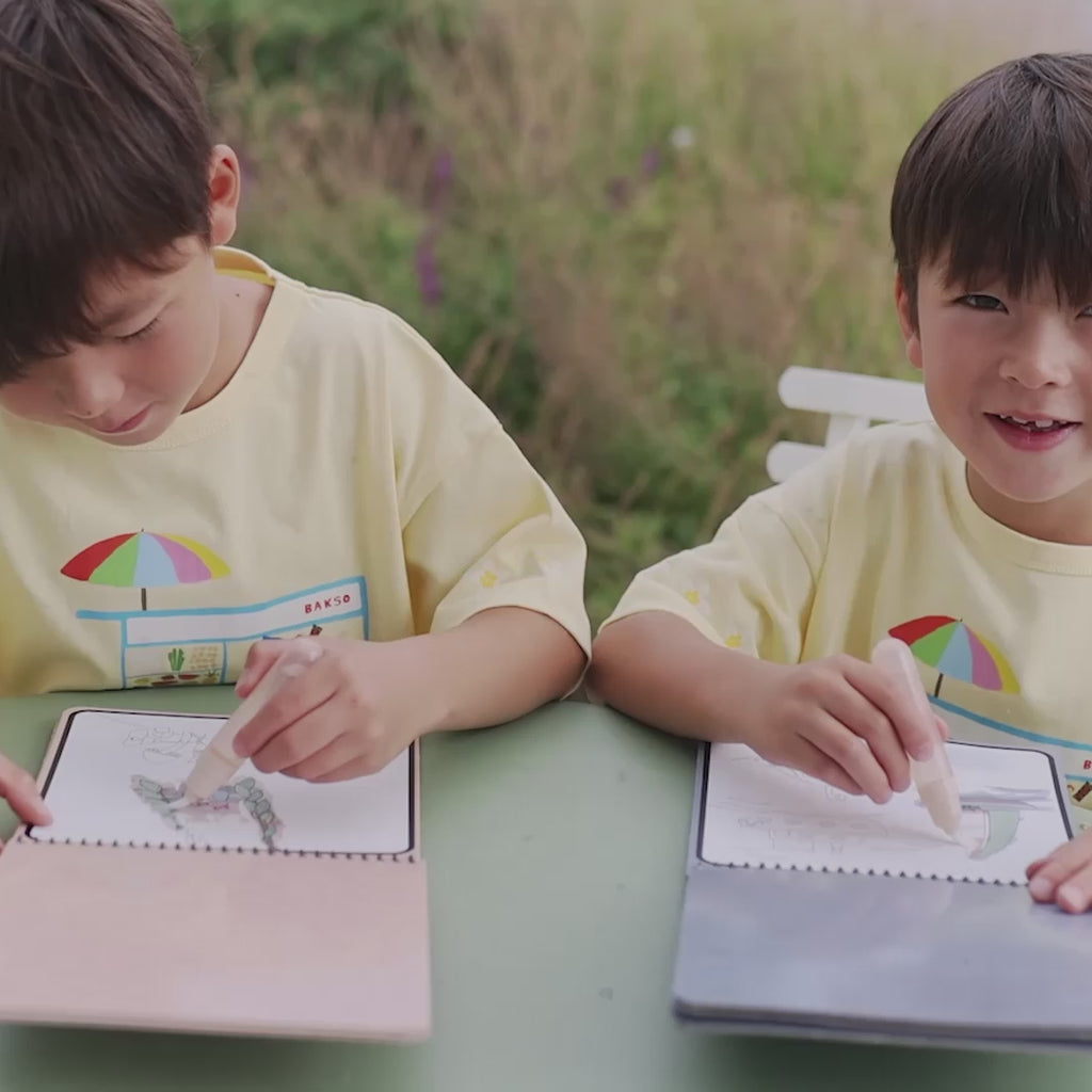 Little imaginations will soar far and wide with the Mushie reusable water color pad. Featuring four pages of colorful planes, trains and automobiles that come to life with just water. A refillable paintbrush allows children to easily “paint” the pages, revealing vibrant scenes and hidden surprises. Once dry, the pages turn back to white, ready to be used again and again. Crafted from FSC Certified paper, this is a sustainable and mess-free way to inspire creativity. Makes a perfect travel companion for little artists on the go.